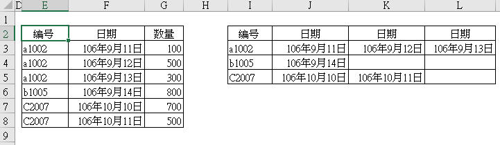 2017-09-17 在指定儲存格顯示日期 179 0 日期資料判斷 【問題】:將F欄中的日期依序顯示在J:L欄指定「編號」項目儲存格中 【問題處理建議公式】 J2公式為: 【=IF(OFFSET($E$2,MATCH($I3,$E$3:$E$8,0)+COLUMN(A:A)-1,0)=$I3,IF(COUNTIF($E$3:$E$8,$E3)=1,OFFSET($E$2,MATCH($I3,$E$3:$E$8,0),1),OFFSET($E$2,MATCH($I3,$E$3:$E$8,0)+COLUMN(A:A)-1,1)),"")】 Excel日期資料Office陣列函數MATCHOFFSETCOLUMNIF 回首頁