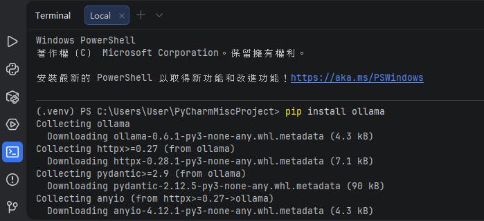 在Windows 上打開PyCharm 左下角的Terminal,在.venv (虛擬環境) 中安裝Ollama 套件