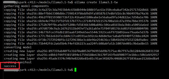 準備好Ollama 之後就要啟用模型,本篇使用Llama-3.1-Taiwan 8B 模型。此模型是基於 Meta Llama-3 做繁體中文Fine-Tuning 的開源 LLM 模型,以提升對於繁體中文的處理品質。其實Ollama 也可以下指令直接把model pull 下來,但本篇先使用hugging face CLI 工具下載。