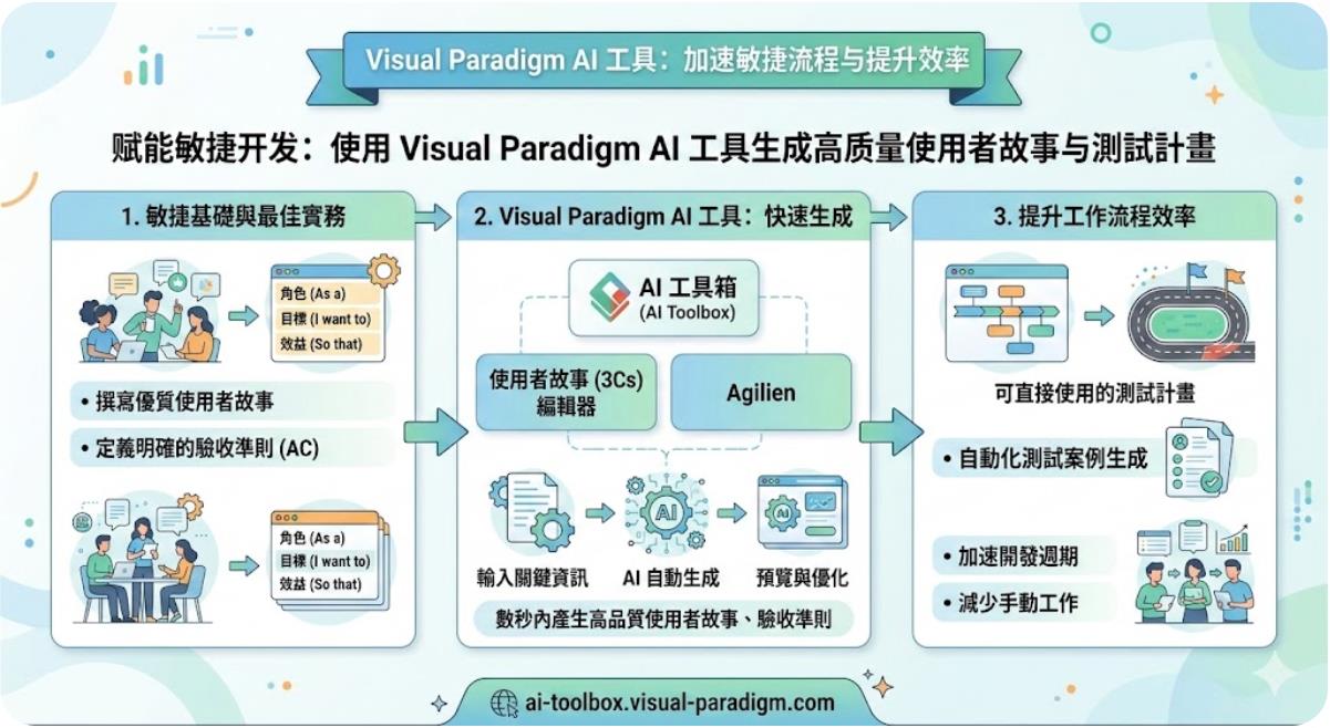 Visual Paradigm 的 AI 工具(內建於其免費試用的 AI 工具箱,ai-toolbox.visual-paradigm.com )可大幅加速此流程。像 「使用者故事 (3Cs) 編輯器」 與 「Agilien」 之類的工具,能在數秒內產生高品質的使用者故事、接受準則,甚至可執行的測試計畫。本文將帶你深入敏捷基礎,分享撰寫優質使用者故事與測試案例的最佳實務,並示範如何使用 Visual Paradigm 的 AI 工具,大幅提升你的開發效率。
