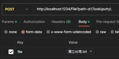 叫用方法, 圖片是把參數放在Params, 但我上面語法改了, 除了GET及上傳檔案以外, 參數要改放在Body的form-data並提供KEY內: