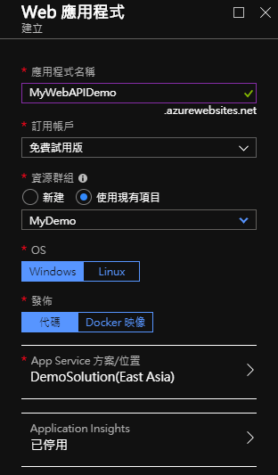 代碼或Docker映像。這裡我選擇的是代碼。 - App Service 方案/位置:可以建立新的項目或選擇已建項目。這裡我是選擇之前已建立好的方案。