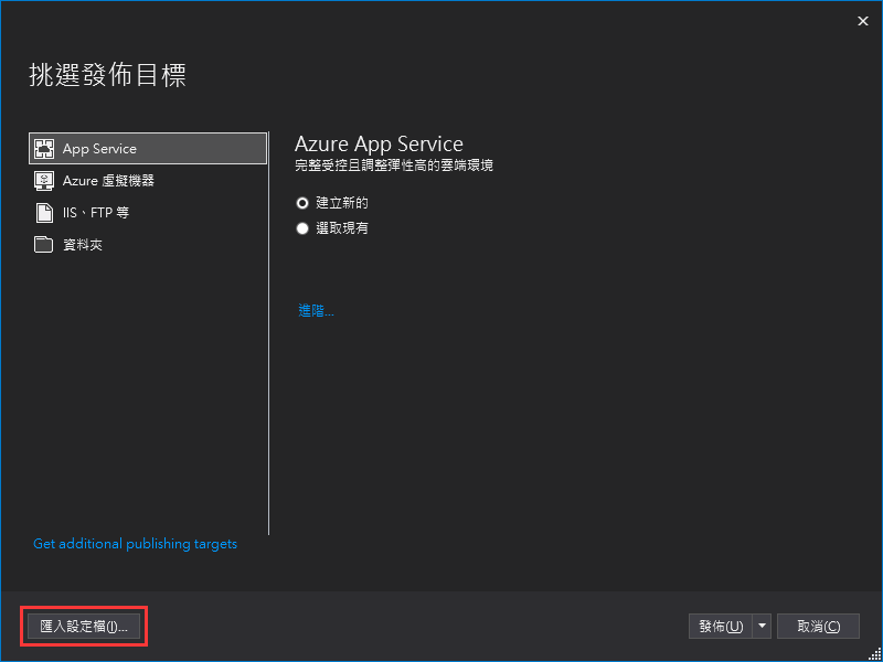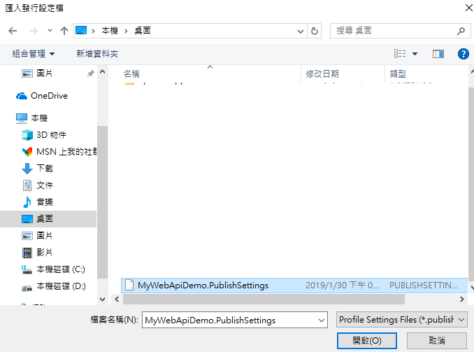 3. 選擇我們剛剛下載的PublishSettings檔案,並點選開啟按鈕。