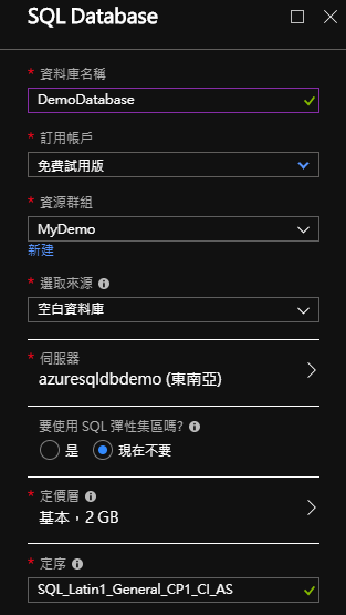 允許 Azure 服務存取伺服器這裡我們可以選「是」,稍後我們的 Web 應用程式才可以存取這台資料庫中的內容。