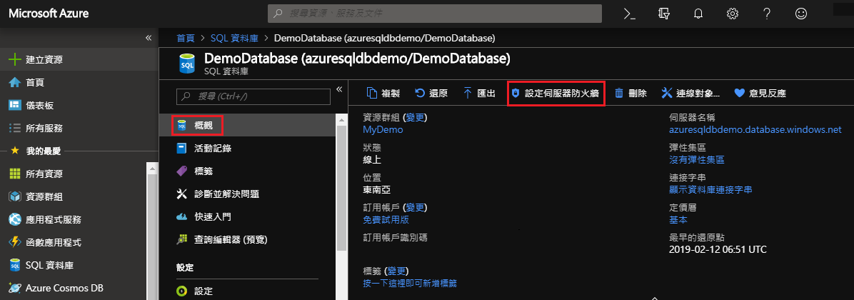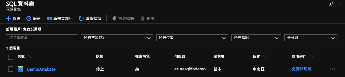 1. 首先登入 Azure 後,點選左邊側邊欄的SQL資料庫