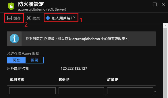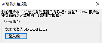 4. 這裡你可以直接選擇登入讓系統自動協助你將目前所在的 IP 位置加入防火牆中,或你可以自己上 Azure 以手動的方式自行將 IP 加入防火牆設定(記得要按下儲存按鈕)。
