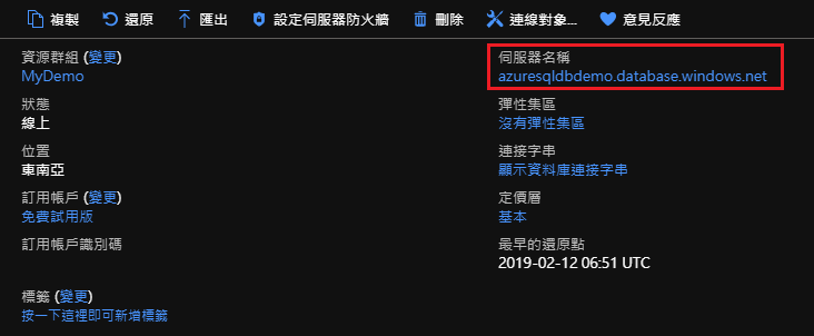 1. 在SQL 資料庫目錄中點選我們剛剛建立好的資料庫,複製伺服器名稱中的值。