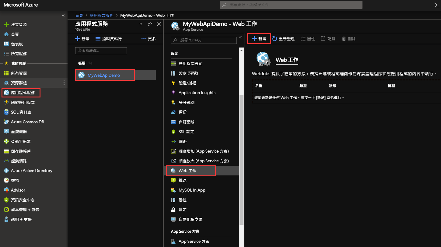 1. 在自有的應用程式服務裡新增一個 WebJob。