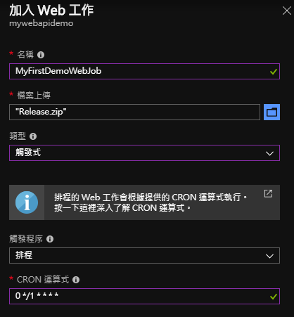 2. 單一執行個體:只會讓你的 WebJob 在單一複本執行,不論 App Service 方案執行個體計數為何。 - 觸發程序:(當類型為"觸發式"時的延伸選項)