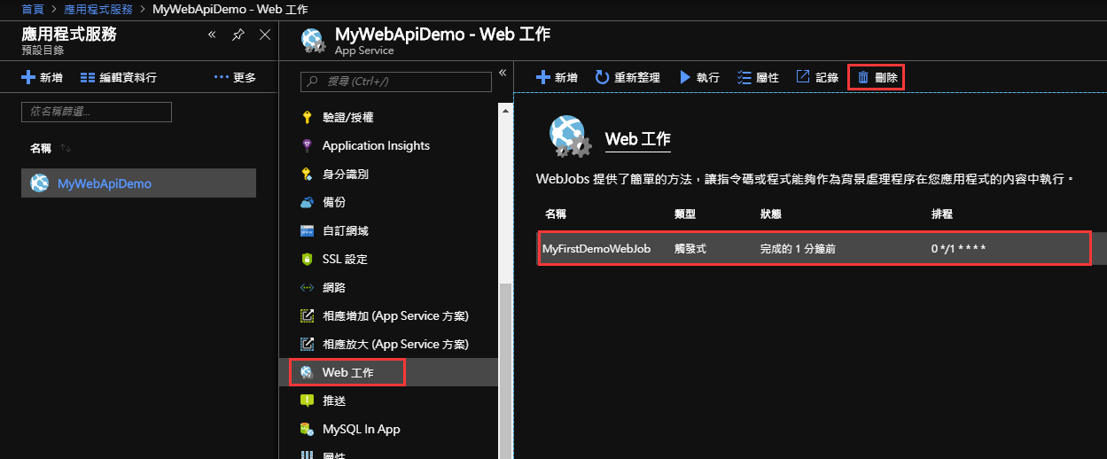 6. 測試完畢後如果要刪除 WebJob 的話,只要到Web 工作裡點選你要刪除的工作並選擇刪除即可。