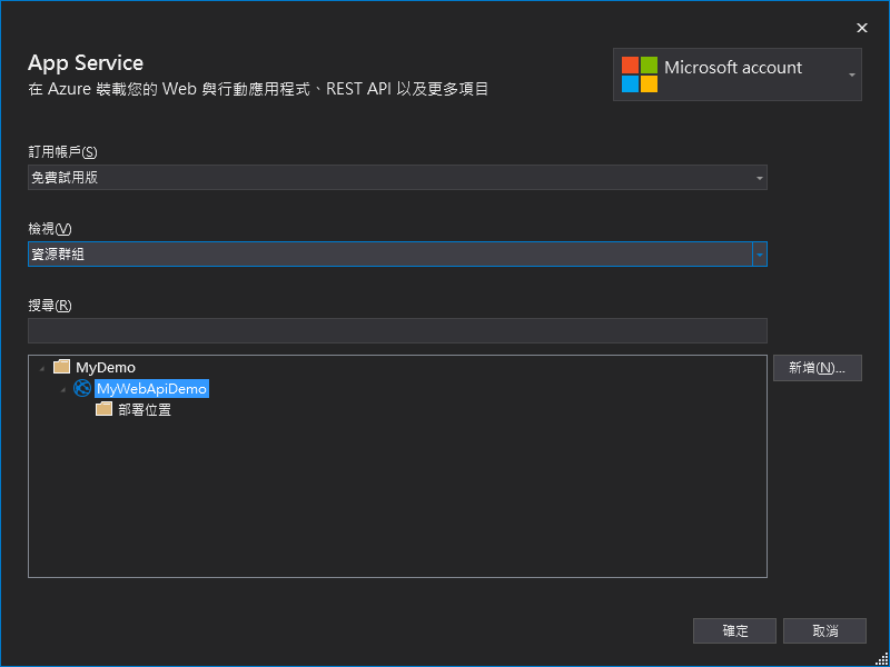 6. 依序選擇你的帳戶及應用程式服務後按確定。