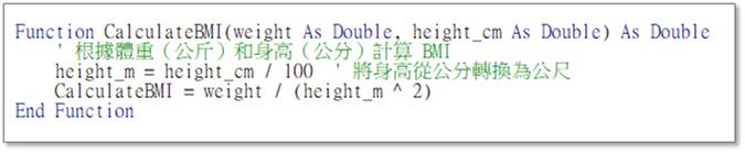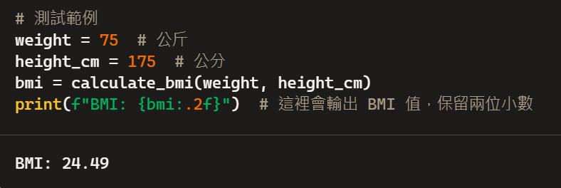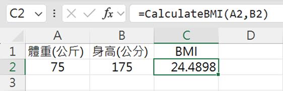 是一種衡量身體脂肪的指標。它是通過體重 (公斤) 除以身高 (公尺) 的平方來計算的。這個指標可以幫助醫生和健康專業人士評估一個人的體重是否在健康範圍內。例如:在自行建立的BMI函數裡,帶入體重75公斤、身高175公分這兩個參數,即可傳回BMI值為24.49。