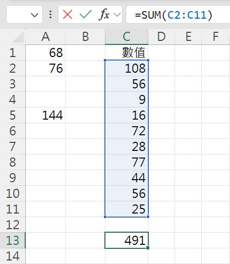 則是另一種SUM函數的表現,此函數裡僅有一個參數,而此參數是一個範圍標示「C2:C11」,這便意味著此SUM函數的執行結果將傳回儲存格範圍C2:C11的總和。