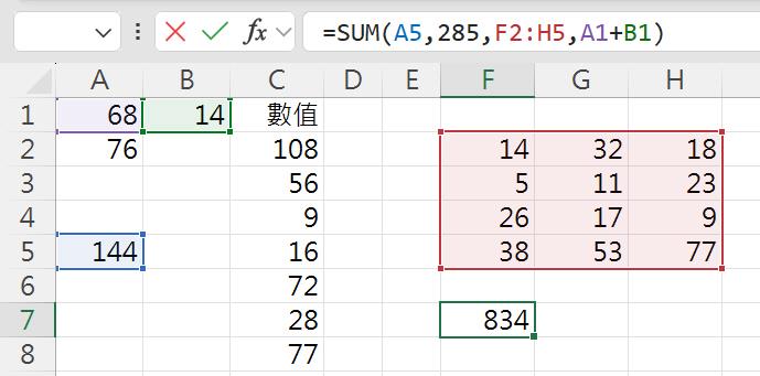 又是另一種SUM函數的表示,此函數裡包含了4個類型不同的參數,第1個參數「A5」是很明確的儲存格位址;第2個參數「285」則是單純的整數值285;第3個參數無庸置值是一個範圍標示「F2:H5」(共有12個儲存格);最後一個參數則是個運算式「A1+B1」。這便意味著此SUM函數的執行結果將傳回這4個參數值的內容與運算結果的總和。