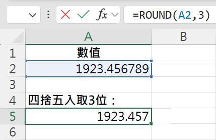 表示此ROUND函數裡的第一個參數是要執行四捨五入的數值,位於儲存格位址A2;第二個參數則是小數位數,因此,此例的結果會將儲存格A2的值進行四捨五入到小數點後3位的轉換。所以,若儲存格A2的值是「1923.456789」。