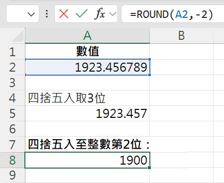 表示此ROUND函數裡的第一個參數是要執行四捨五入的數值,仍是位於儲存格位址A2的值;第二個參數是-2,因此,此例的結果會將儲存格A2的整數值進行四捨五入到小數點前2位的轉換。而針對小數點前兩位23,進行四捨五入後是00,因此其四捨五入後的結果會是1900,也就是將數字四捨五入到最接近的百位數(即小數點前2位)。