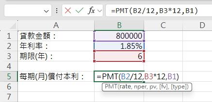 參數裡關於利率、期數等參數的預設單位都是「年」,而此範例我們追求的是每月償付的本利,因此,必須事先調整為以月為單位,也就是年利率必須先除以12、期數年必須先乘以12: