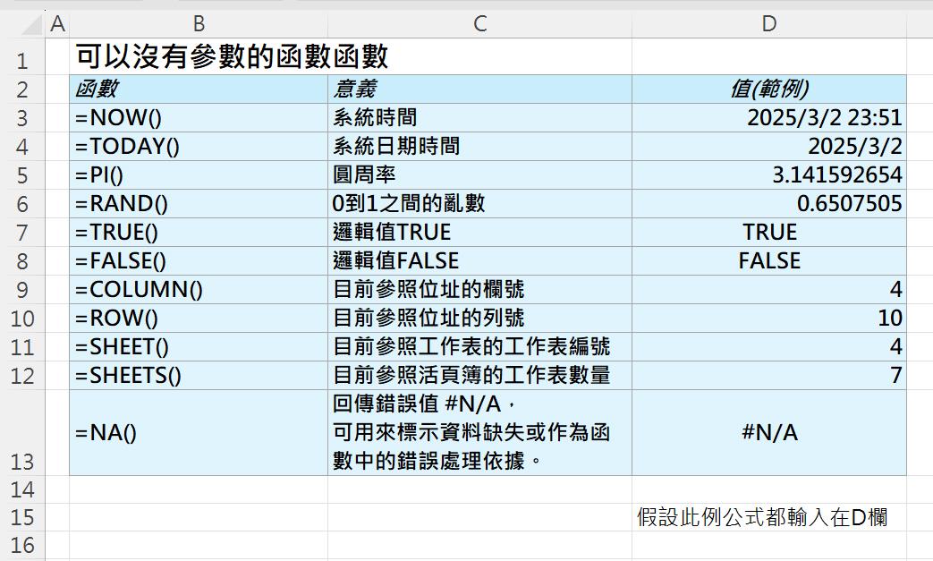 Excel提供了數百個內建函數供使用者運用,大多數的函數都需要提供參數方能進行運算,也有少部分函數不需要任何參數即可傳回特定意義的結果值。例如:
