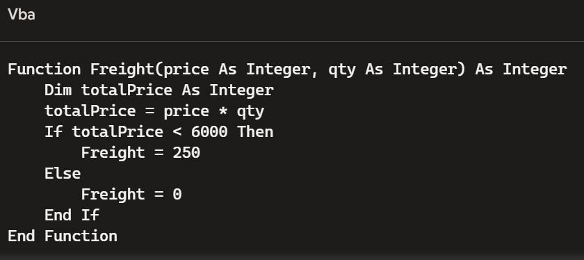 從前一篇文章的介紹,大家應該對「函數」的功能有了一定的瞭解與認知,那就是函數都有著特定的目的與功能,在透過參數的供給後而運算並傳回所需的結果值。在Excel環境裡,除了內建的函數外,使用者也可以透過VBA程式碼的撰寫,建立客製化的自訂函數。例如:建立一個名為Freight的函數,可以傳回整數型態的結果。此函數包含2個參數,第一個是參數是整數型態的price、第二個是參數是整數型態的qty。運費Freight的計算規則是當總價低於6000元,運費是250,否則運費為0。