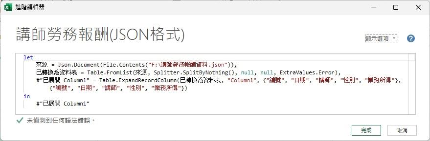 從上述的範例可以了解清單轉換成資料表的靈活與彈性,也由此可見在Power Query的環境下,匯入以清單為結構的JSON檔案格式時,清單轉換為資料表的步驟是何等的重要。