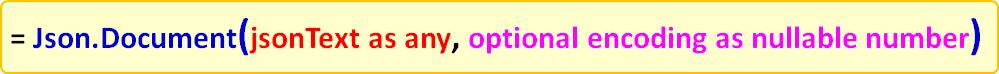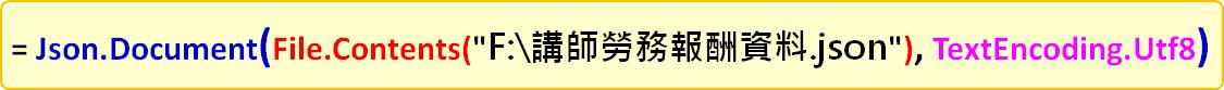 Json.Document( )也是Power Query的內建函數,其目的是用於解析JSON格式的資料,主要功能是將JSON字串轉換為Power Query可處理的資料結構,例如記錄(Record)或列表(List)。如同前例介紹的Csv.Document()函數,此函數裡的第1個參數也是描述要讀取的Json檔案之完整路徑與檔案名稱,所以在此也常搭配另一個內建函數File.Contents( )。而此Json.Document( )函數的標準語法為: