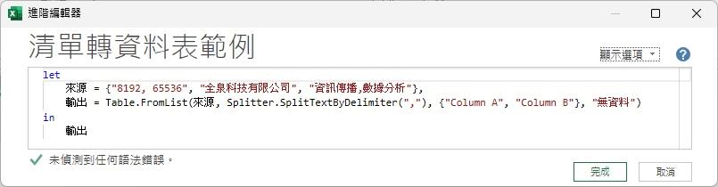 {來源, Splitter.SplitTextByDelimiter(","), {"Column A", "Column B"}, "無資料")