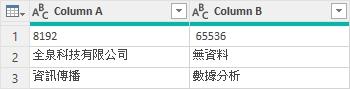 則輸出的查詢結果便是資料行名稱分別為Column A與Column B且包含3筆資料列的資料表,原本清單裡的元素,轉換成一筆筆的資料列,而元素裡有缺失的資料則填充了字串"無資料"。