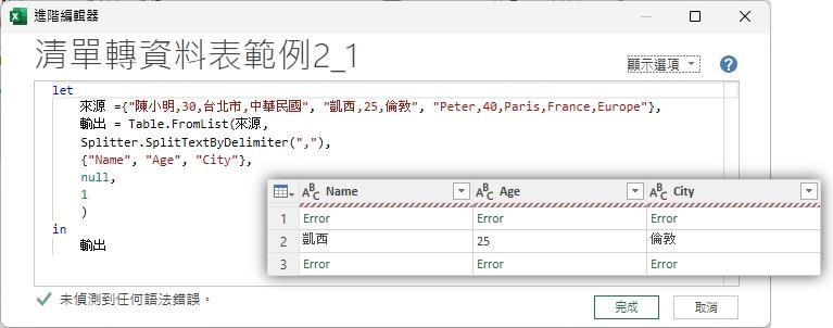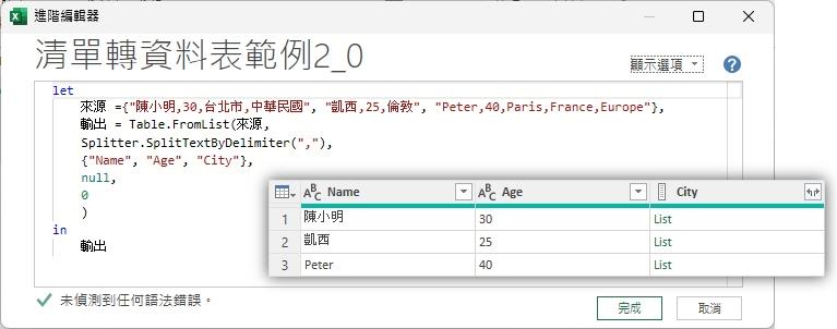 輸出 = Table.FromList(來源,Splitter.SplitTextByDelimiter(","),{"姓名", 年齡", "城市"},null,0)