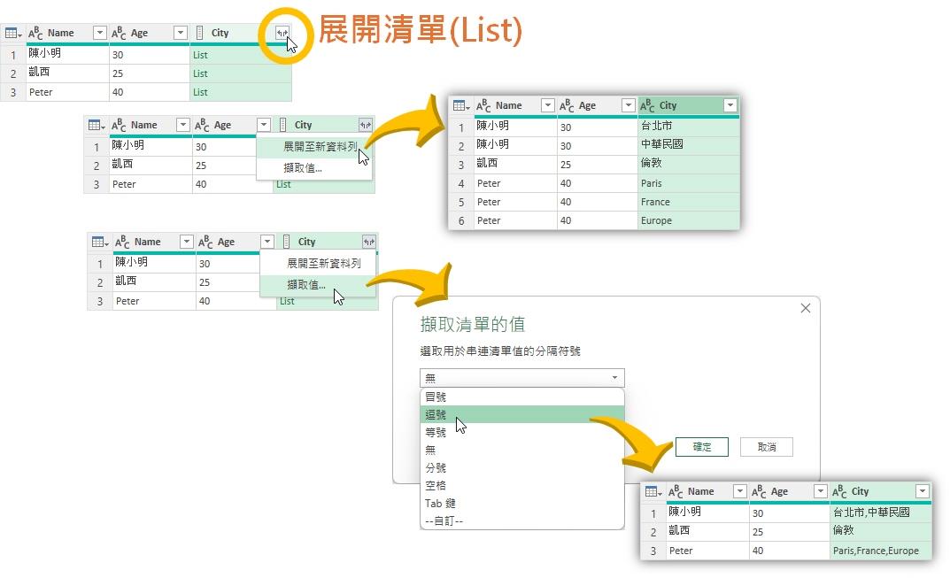 = Table.ExpandListColumn(輸出, "City") - 「擷取值」(Extract Values)