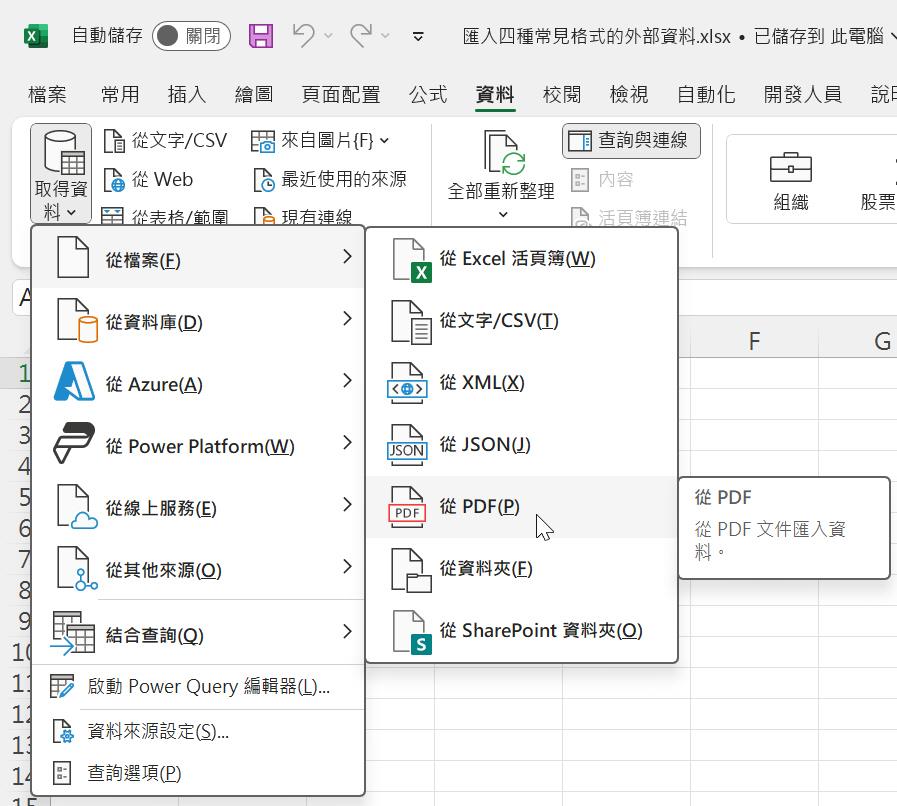 首先,開啟空白活頁簿後點按[資料]索引標籤[取得資料]命令按鈕,從展開的功能選單中點選[從檔案]裡的[從PDF]功能選項。