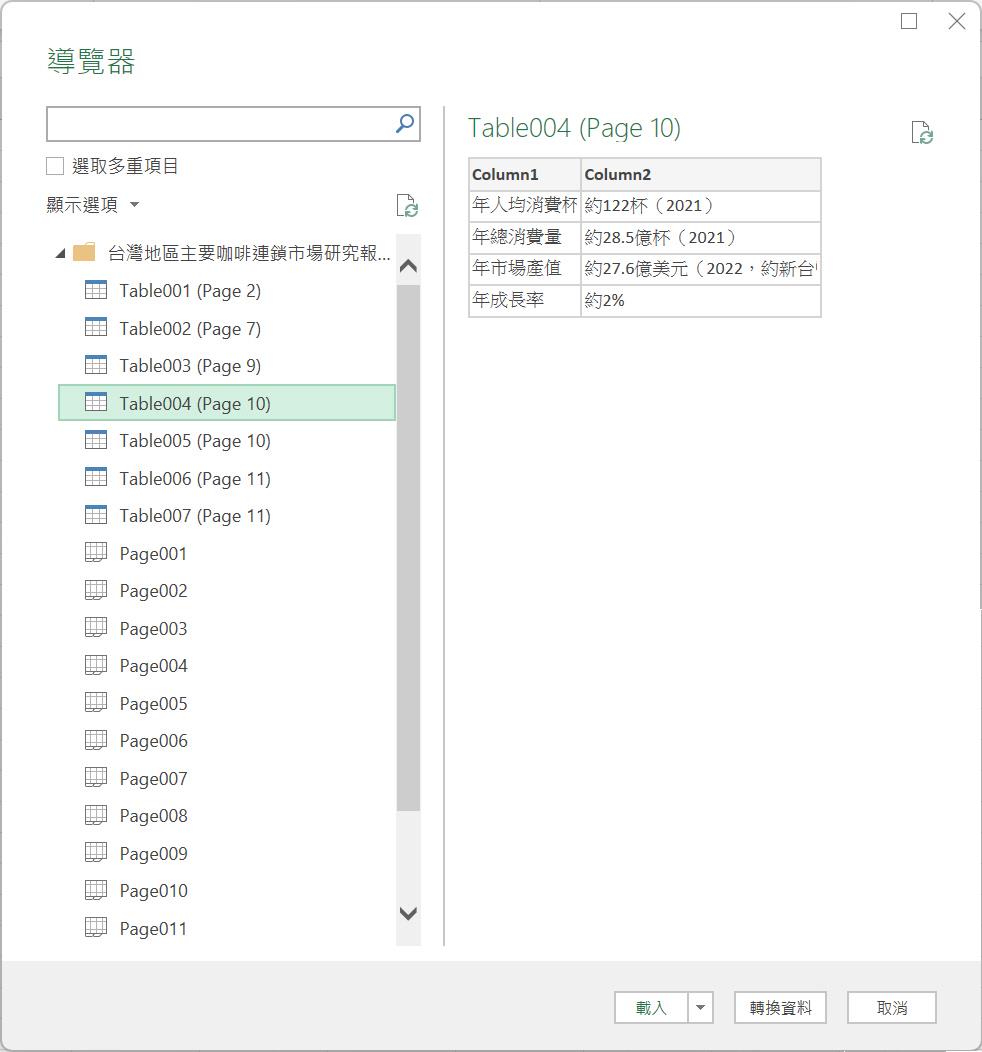 開啟[匯入資料]對話方塊,選擇此文章的實作範例檔案[台灣地區主要咖啡連鎖市場研究報告.pdf]。
