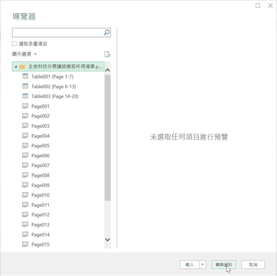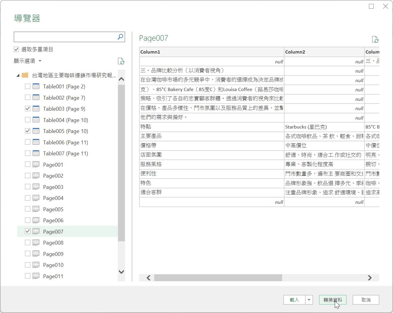 在此我們勾選「選取多重項目」核取方塊後,分別勾選所要的「Table003(Page9)」、「Table005(Page10)」與「Page007」等三個資料來源。最後,點按[轉換資料]按鈕。