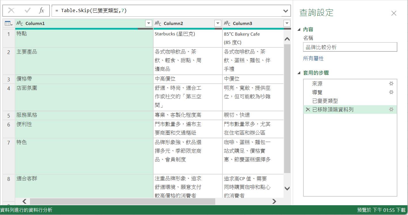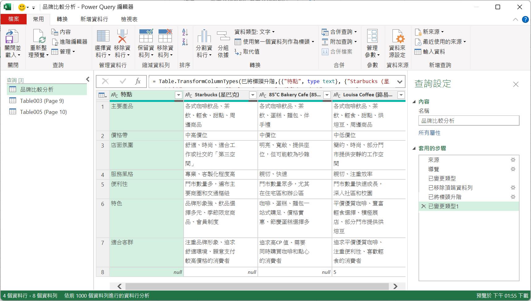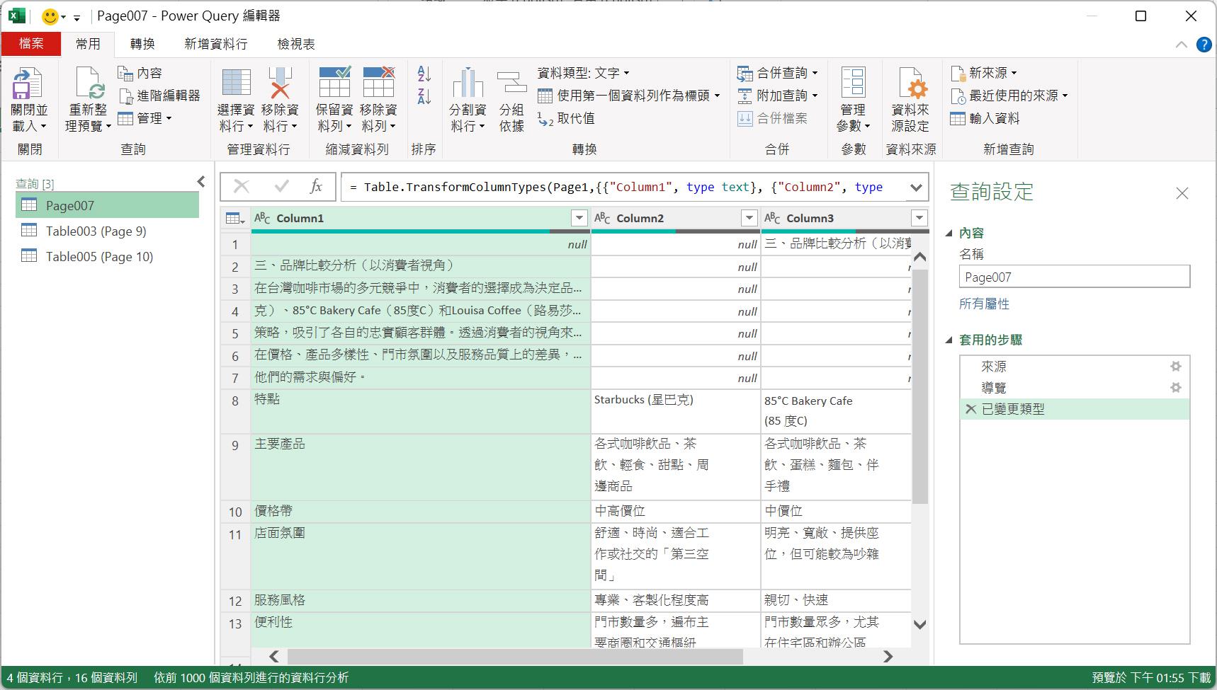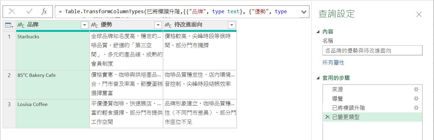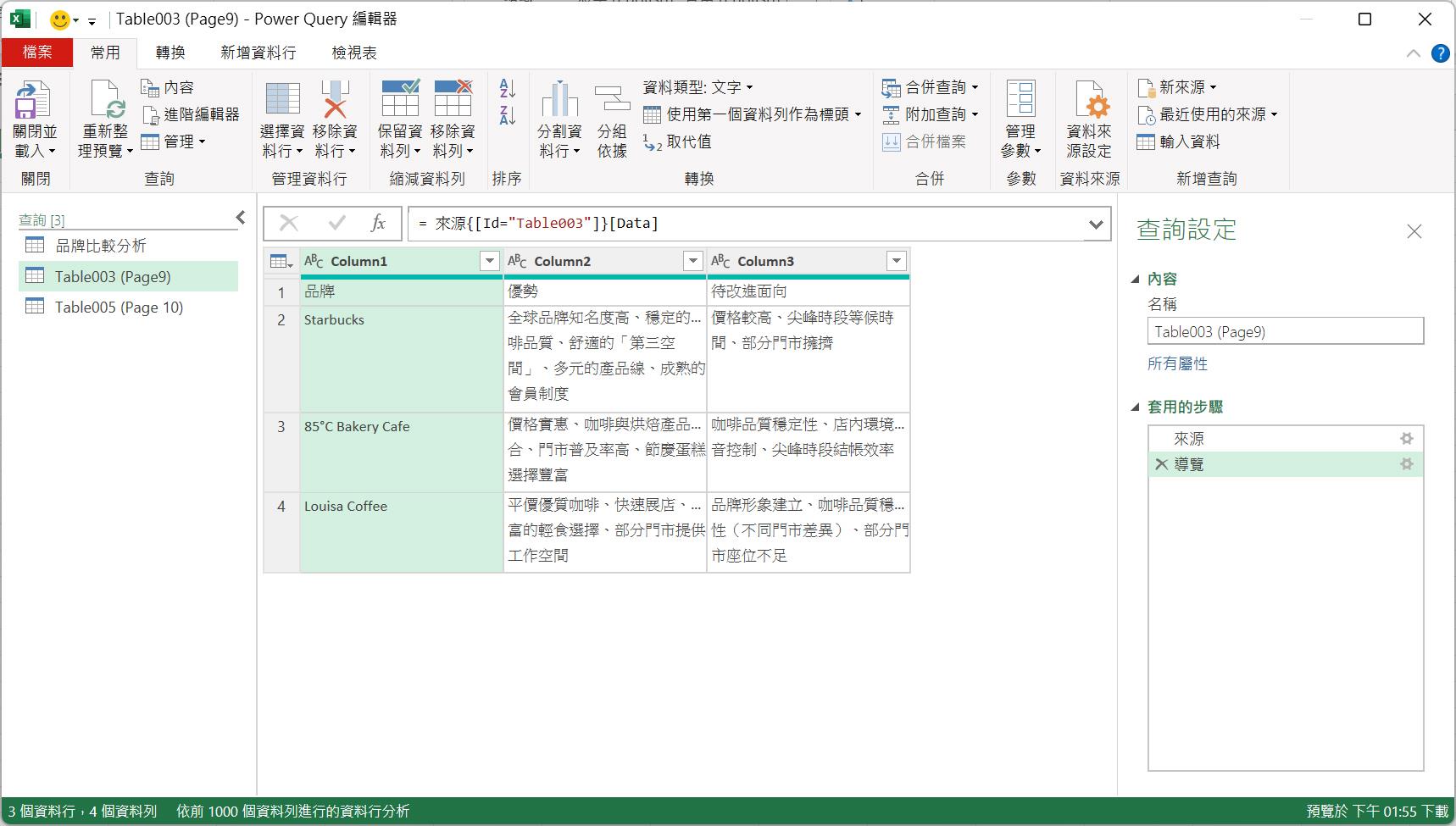 接著,開始處理第2個查詢,這是來自Table003(Page9)的資料來源,描述著三個品牌咖啡連鎖店的品牌優勢及改進面向,這已經是一個很完美的表格解析了,就差一步要將資料表的首列升級為資料表的資料行名稱,以取代目前的Column1、Column2、Column3等預設的資料行名稱。