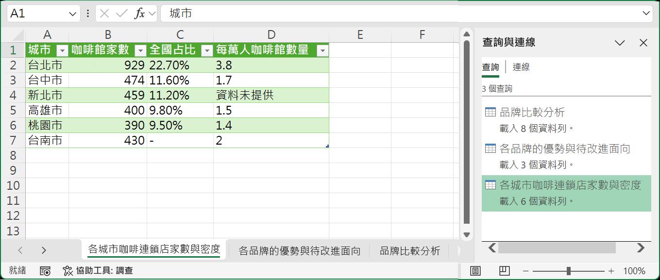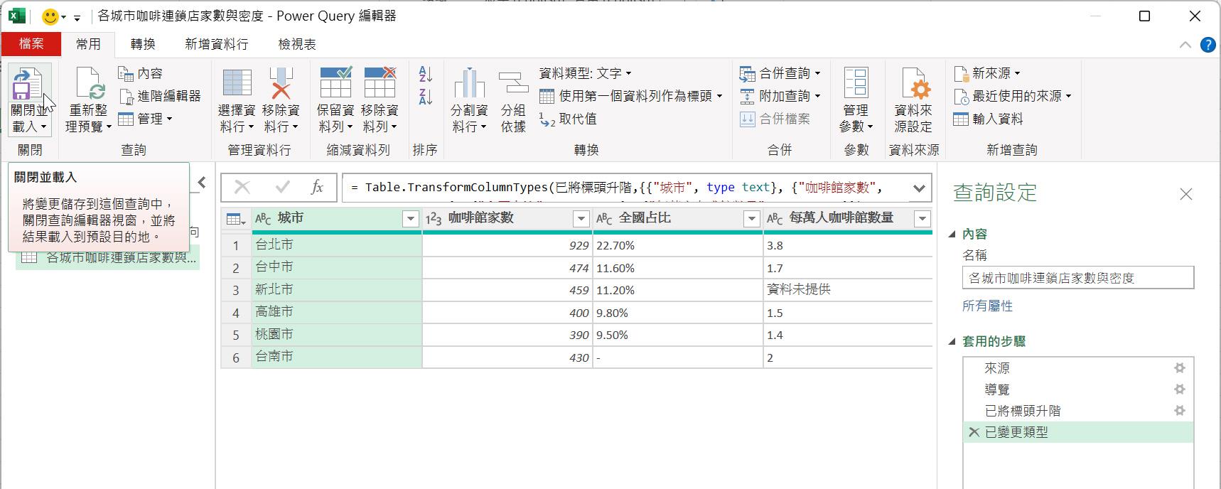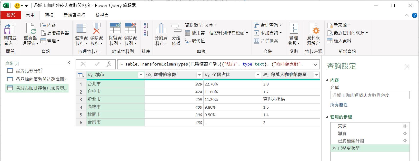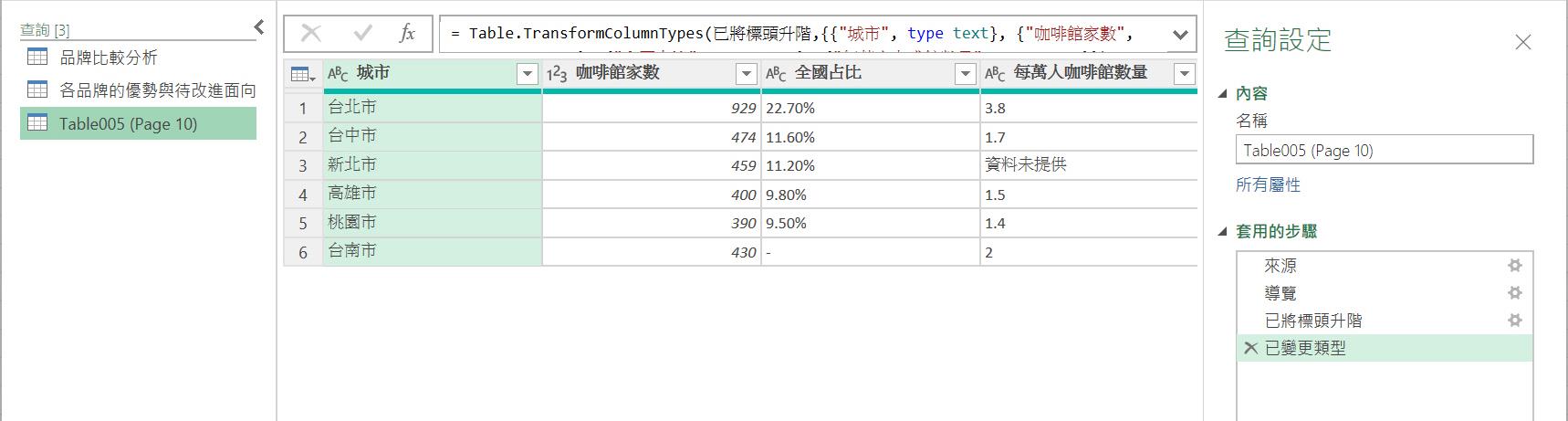 最後來到最後一個查詢來源囉!這個預設名為Table005(Page10)的查詢,描述著三大咖啡連鎖店在各縣市的家數與密度。這次的解析更精準,連資料行名稱都很符合需求。