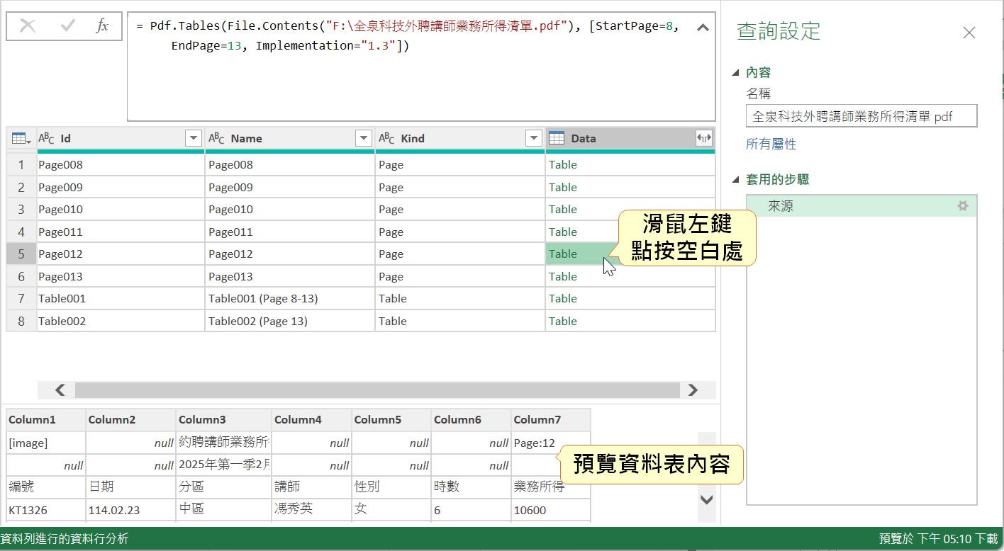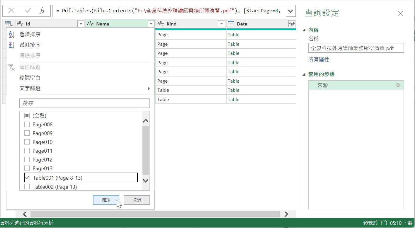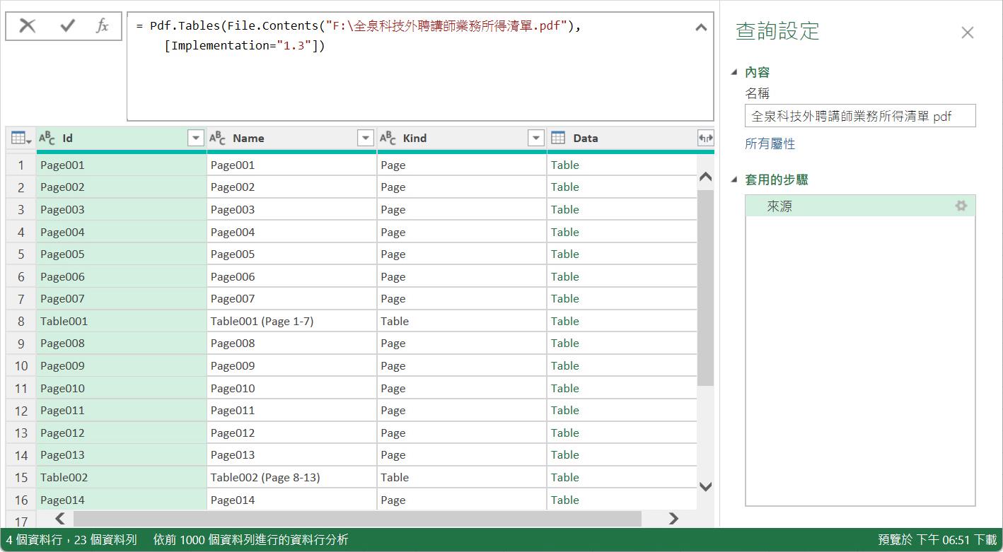 隨即開啟Power Query編輯器,立即看到每一個解析的頁面與表格的資料屬性。而僅有的這一行程式碼即為Pdf.Tables()函數與File.Contents()函數: