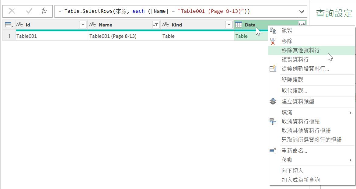 篩選的結果將是留下8-13頁的頁面之解析結果,也就是將這份連續6頁的PDF內容萃取出資料表格的查詢結果。而這份資料表則僅需保留[Data]資料行即可。因此,可以在點選該資料行後,透過【移除其他資料行】的功能操作達到目的。