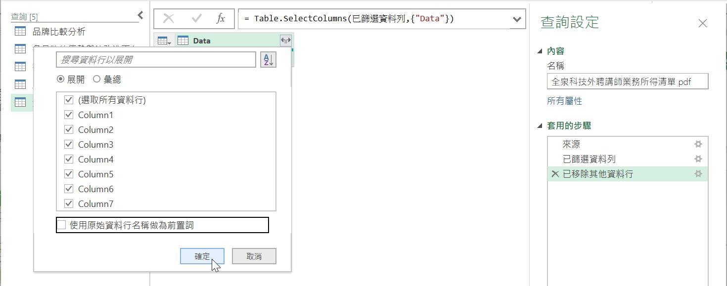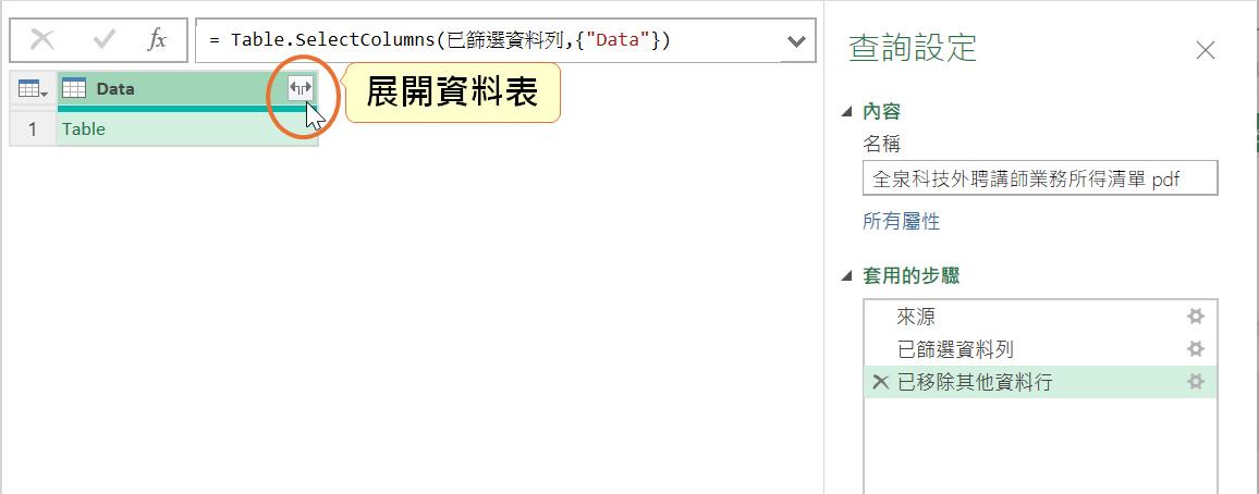 = Table.ExpandTableColumn(已移除其他資料行, "Data", {"Column1", "Column2", "Column3", "Column4", "Column5", "Column6", "Column7"}, {"Column1", "Column2", "Column3", "Column4", "Column5", "Column6", "Column7"})