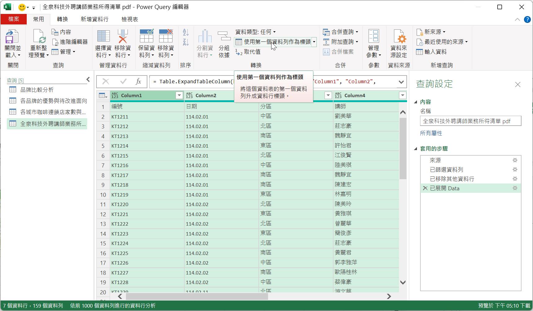 分散在各頁面的同一資料表格就彙整起來了,此時便可以點按[常用]索引標籤裡的[使用第一個資料列做為標頭]命令按鈕,將查詢結果的首列升級為真正的資料行名稱。也就是先前我們曾經學習過的Table.PromoteHeaders()函數。