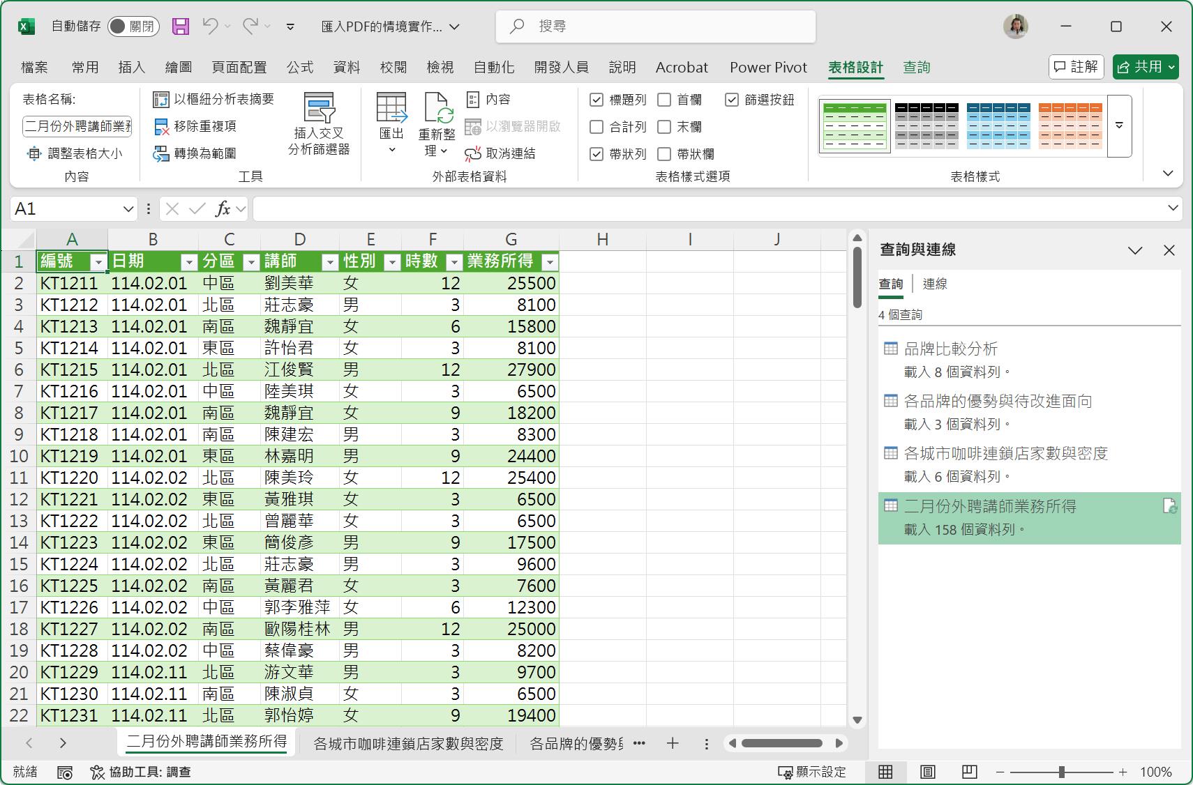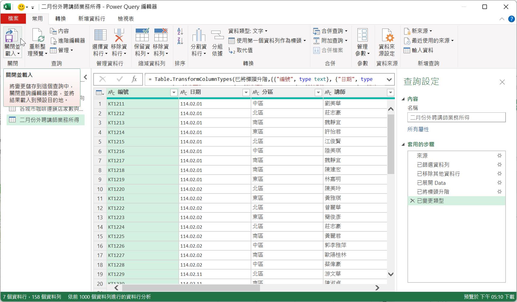 最後,可以將此查詢結果重新命名為較符合意義,也較易理解的查詢名稱。例如:「二月份外聘講師業務所得」。完成的查詢結果將形成一張包含158筆資料紀錄的資料表。藉由[檔案]索引標籤裡的[關閉並載入]命令按鈕。,