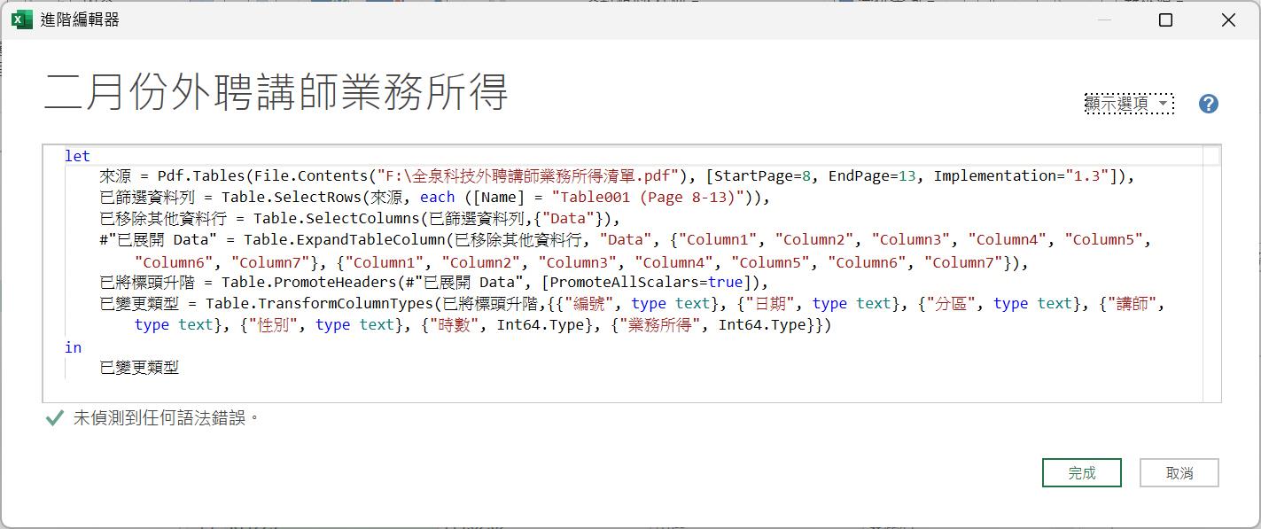 = Pdf.Tables(File.Contents("F:\全泉科技外聘講師業務所得清單.pdf"),