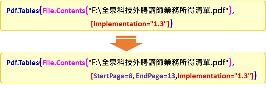 輸出 = Pdf.Tables(來源, [StartPage=2, EndPage=5, Implementation="1.3"])