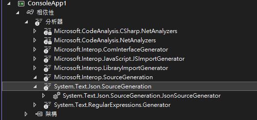 我們在建立專案後可以在【相依性】→【分析器】中看到 System.Text.Json.SourceGeneration.JsonSourceGenerator。