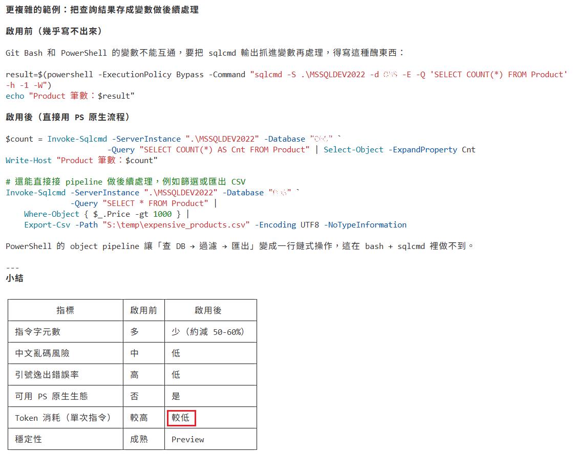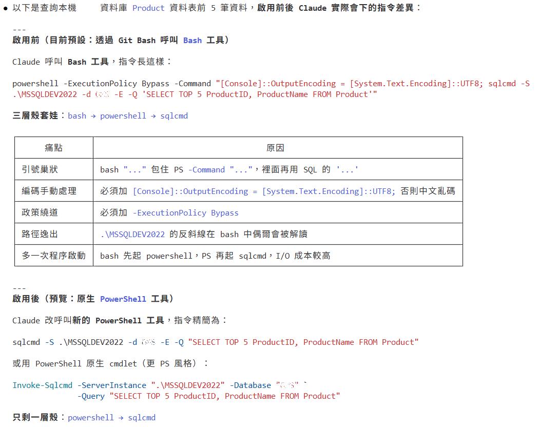 可以試著啟用上述設定,讓 claude code預設使用Powershell工具而不是Git Bash,這樣會讓 claude code叫用微軟軟體的指令變得精簡許多節省token = 節省你的開銷費用